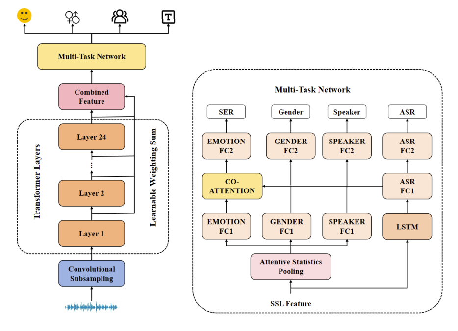 远鉴所提出的多任务学习(MTL)方案结合了情感识别、性别分类、说话人验证和语音识别任务。该方案通过一种协作注意力机制,动态建模情感任务与辅助任务特征之间的交互,实现上下文感知的特征动态融合。此外,为应对少数类别样本识别困难以及语义相似样本难以区分的挑战,引入了一种加权焦点-对比学习损失函数,有效缓解了类别不平衡和语义混淆问题。