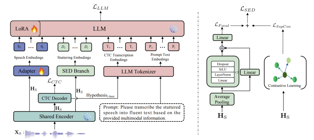 针对这一长期存在的技术难题,我们提出了一种由大语言模型(LLM)驱动的ASR-SED多任务学习框架。该框架通过动态交互机制,利用ASR分支生成的CTC软提示来辅助LLM的上下文建模,同时通过SED分支输出口吃嵌入来增强LLM对口吃语音的理解。结合对比学习和Focal Loss的混合优化策略,该技术在普通话口吃语音场景下,成功实现了ASR与SED性能的双重突破,为言语康复等应用提供了坚实的技术支撑。