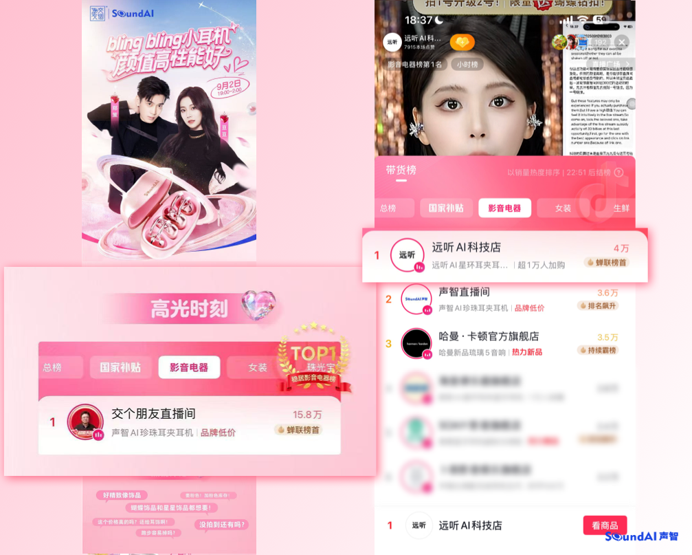 9月2日,声智与“交个朋友”罗永浩直播间合作,单场直播6小时销售额突破纪录;同一天,声智官方授权抖音店铺“远听AI科技”新品上线仅4小时即冲上带货榜榜首。