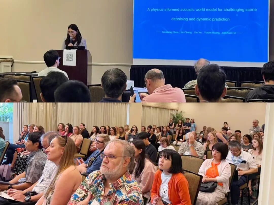 当地时间2025年12月1日,全球声学领域的学术盛会——第六届美国声学学会与日本声学学会联合会议(6th Joint Meeting of ASA/ASJ)在夏威夷檀香山隆重召开。声智科技(SoundAI)团队凭借突破性研究 《面向复杂场景降噪与动态预测的物理信息声学世界模型》(A physics-informed acoustic world model for challenging scene denoising and dynamic prediction)入选,是计算声学(Computational Acoustics)领域唯一入选的中国团队。声智联合创始人常乐代表团队做了学术报告,首次介绍物理信息约束的声学世界模型(PI-AWM),向全球学界展示了中国声学AI的前沿探索。
