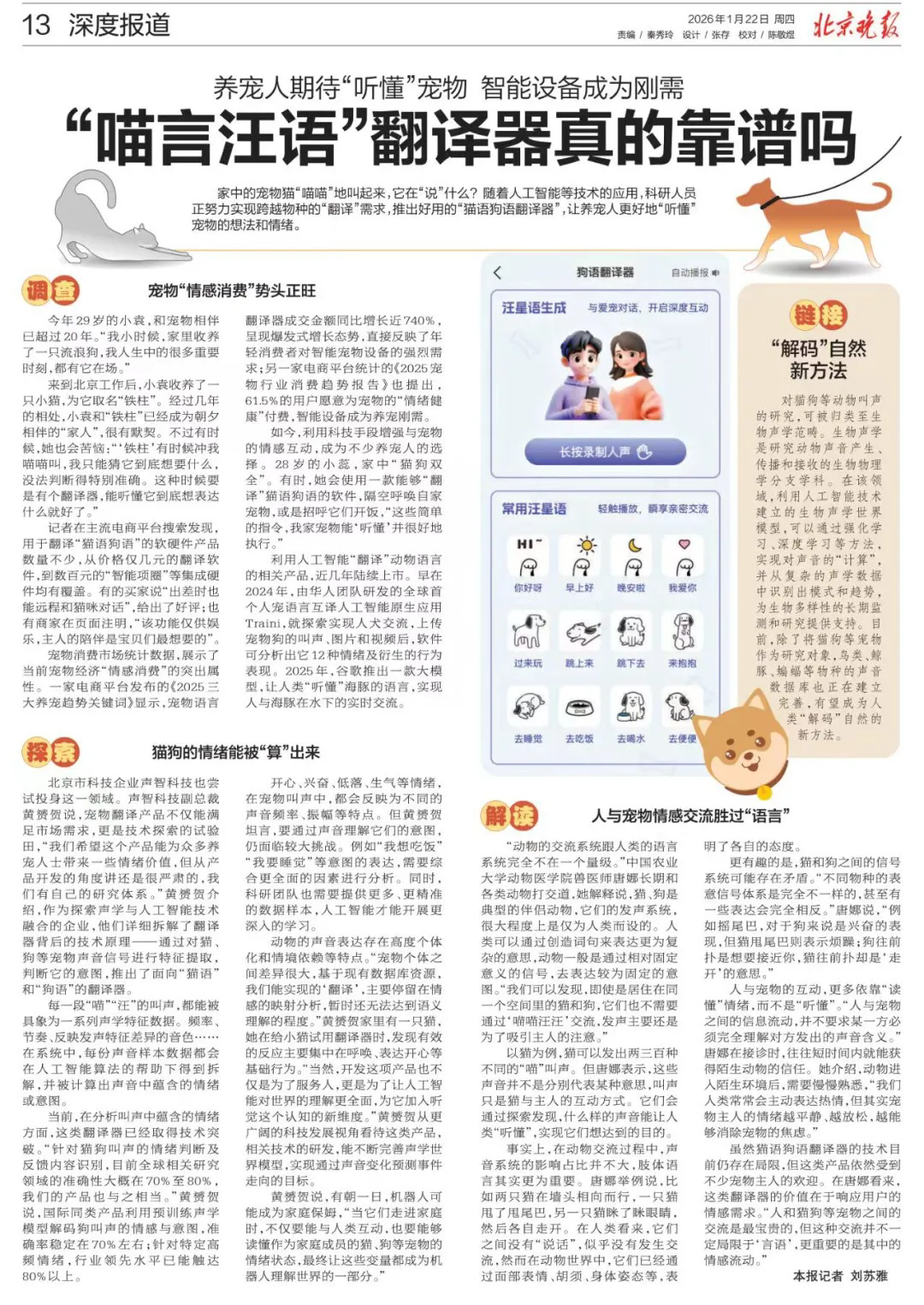 近期,在主流媒体的聚光灯下,声智科技在生物声学领域的研发成果也引发了媒体的持续关注。《北京晚报》“深度报道”专栏,展示了声智通过声学AI模型,实现对猫、狗等生物情感及特定行为声学信号的解析。据媒体报道,这不仅是声智技术对宠物AI赛道的赋能,更是“声学感知、声学表达、声学探测”核心算法在AI应用场景下的体现,以及在复杂环境下处理和解析声学信号的多行业落地验证。(相关文章推荐:超越谷歌Perch 2.0的广谱感知力,声智声学模型让AI听见物理世界)