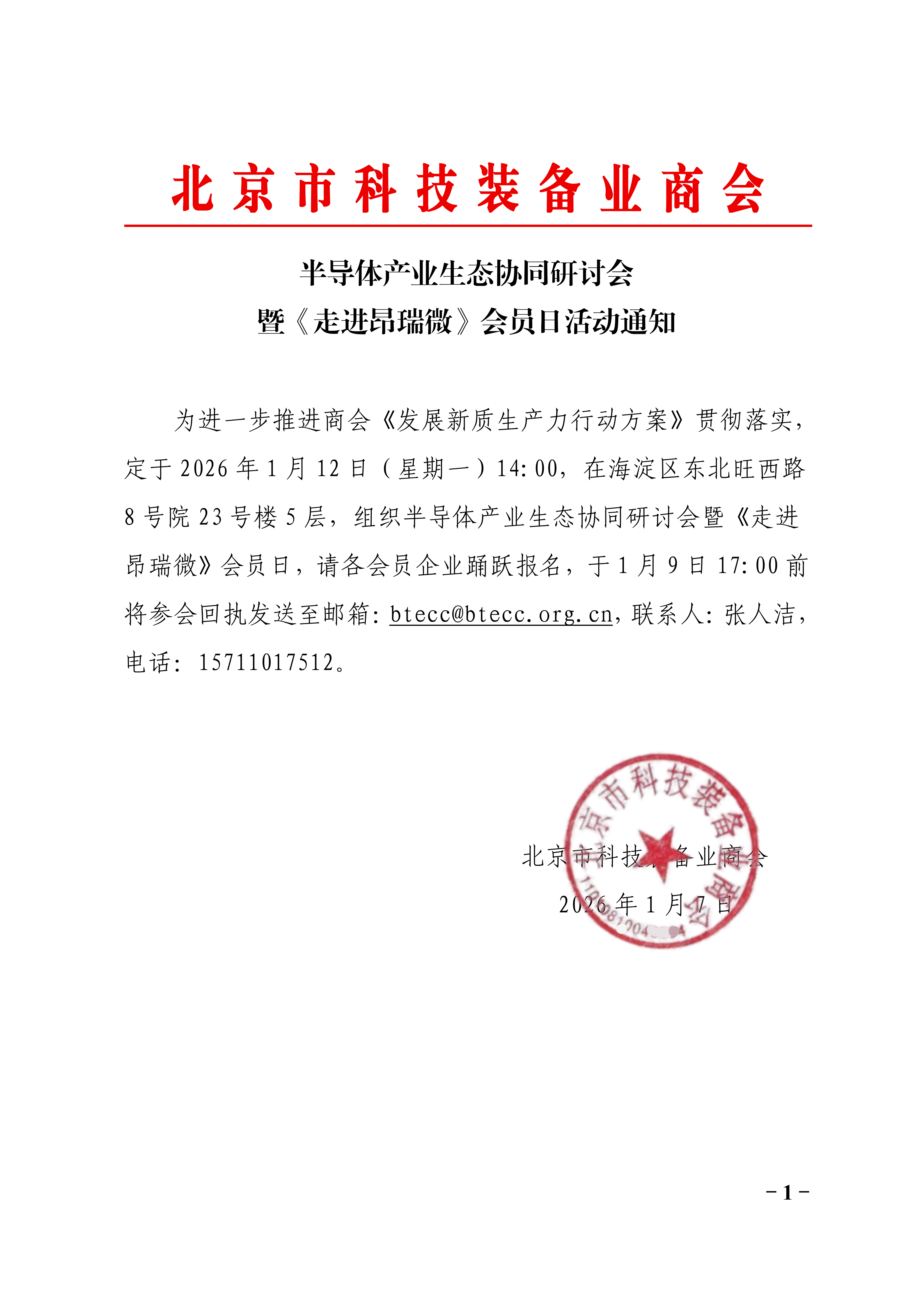 为进一步推进商会《发展新质生产力行动方案》贯彻落实,定于2026年1月12日(星期一)14:00,在海淀区东北旺西路8号院23号楼5层,组织半导体产业生态协同研讨会暨《走进昂瑞微》会员日活动,请各会员企业踊跃报名,于1月9日17:00前将参会回执发送至邮箱:btecc@btecc.org.cn,联系人:张人洁,电话:15711017512。