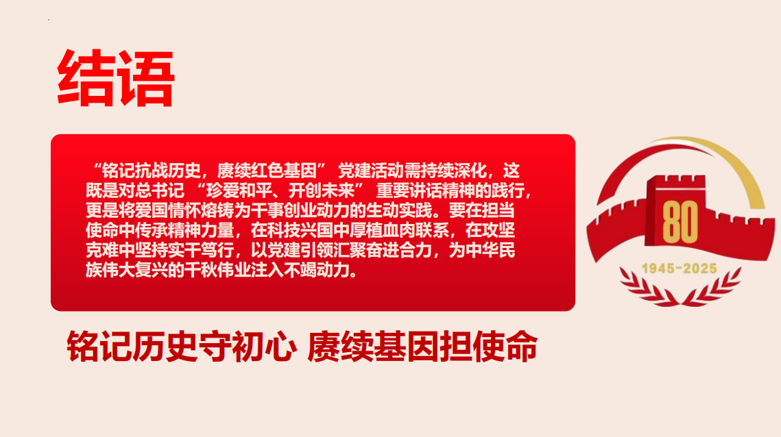 最后,柳培虎书记强调:我们以“铭记抗战历史,赓续红色基因”为主题,参观了中国人民抗日战争纪念馆、观看了《南京照相馆》、集中观看阅兵,今天又专题讲授党课,旨在传承抗战精神,珍爱和平,开创未来。希望每名同志通过一系列的主题党日活动,把爱国情怀转化为干事创业的动力,在担当使命中传承精神力量,在科技兴国中强化血肉联系,在攻坚克难中做到实干笃行,为中华民族复兴大业贡献力量。