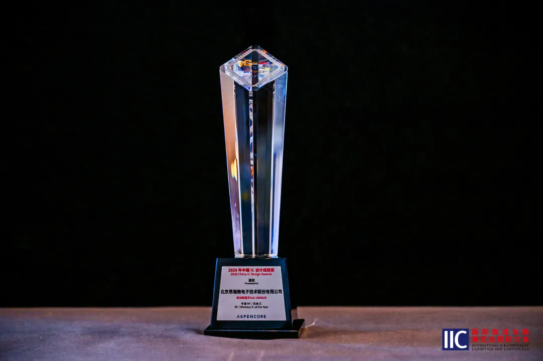 北京昂瑞微电子技术股份有限公司低功耗蓝牙SoC OM6629荣获2026年度中国IC设计成就奖——热门IC产品类“年度RF/无线 IC”奖项。