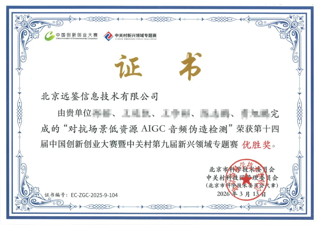 远鉴作为专注于人工智能技术和信息安全的国家级专精特新“小巨人”企业,是多维身份识别与可信认证国家工程研究中心共建单位,具备顶尖的听觉及视觉全栈AI技术和服务能力,在声纹识别、多维生物特征识别、音视频鉴伪技术方面处于国内领先地位。