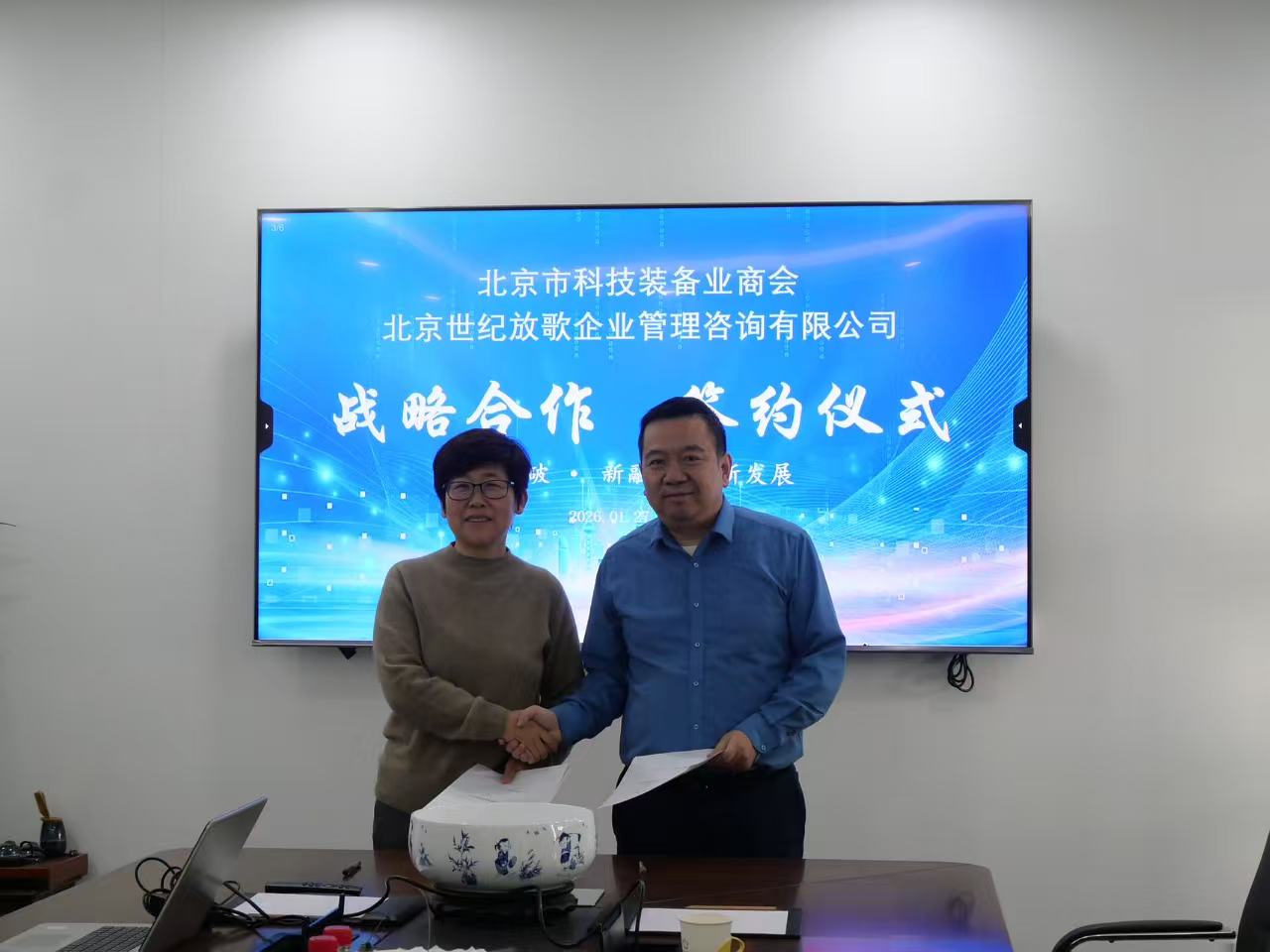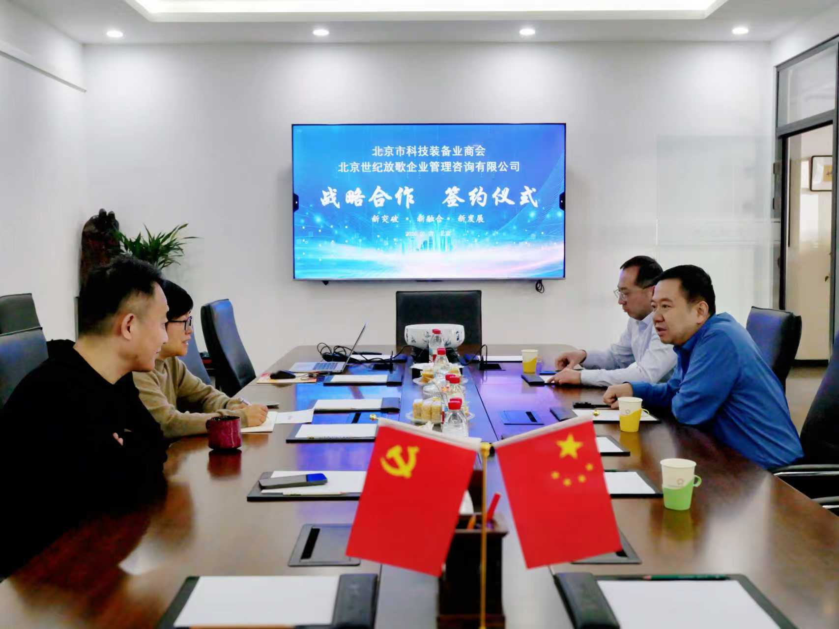 商会办公室主任王猛、会员部部长张人洁,世纪放歌副总经理崔树山参加签约仪式。